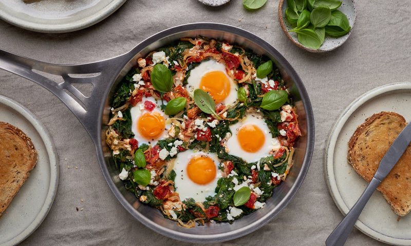 پالک آئرن، وٹامن K اور لوٹین سے بھرپور ہے، جو آنکھوں اور خون کی صحت کے لیے انتہائی مفید ہیں۔ انڈے کی یولک میں موجود چکنائی پالک میں موجود غذائی اجزاء کے جذب کو بہتر بناتی ہے۔ یہ امتزاج غذائیت میں اضافہ کرتا ہے اور ایک ہلکی اور صحت بخش ڈش کے طور پر روزمرہ ناشتے میں شامل کی جا سکتی ہے۔